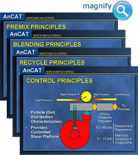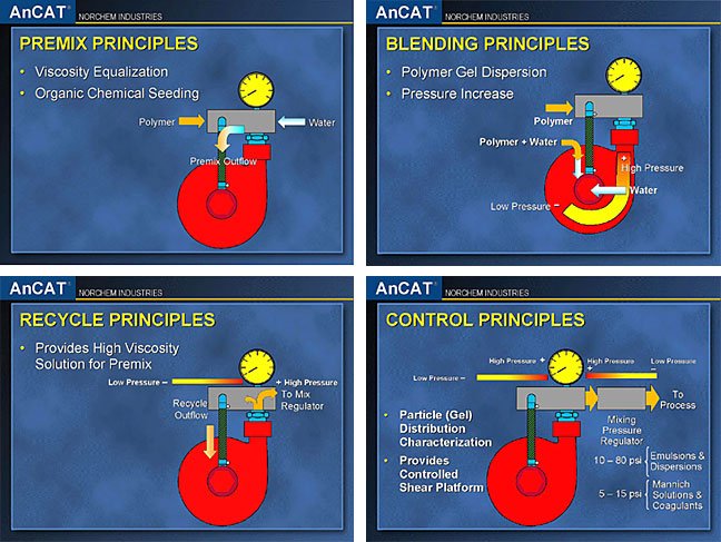 Norchem's AnCAT®, ProCAT™ and Sharpshooter™ liquid polymer systems are designed to process and deliver the full range of HMW (high-molecular-weight) polymers in the emulsion, dispersion and solution form. The unique four-step process is controlled by the patented, pressure regulated, AnCAT hydraulic mixing circuit. Liquid polymer and water combine through the four processing stages of premixing, blending, recycling and control to invert, disperse and condition the polymer for maximum activity development in the dilute aqueous solution phase. The entire process benefits from judicious applicaton of proven physical and chemical principles of kinetic acceleration, polymer dispersion, viscosity equalization, pressure equilibrium and polymer structuring, which influence the activity, quality and performance of the optimally conditioned aqueous polymer solution product.